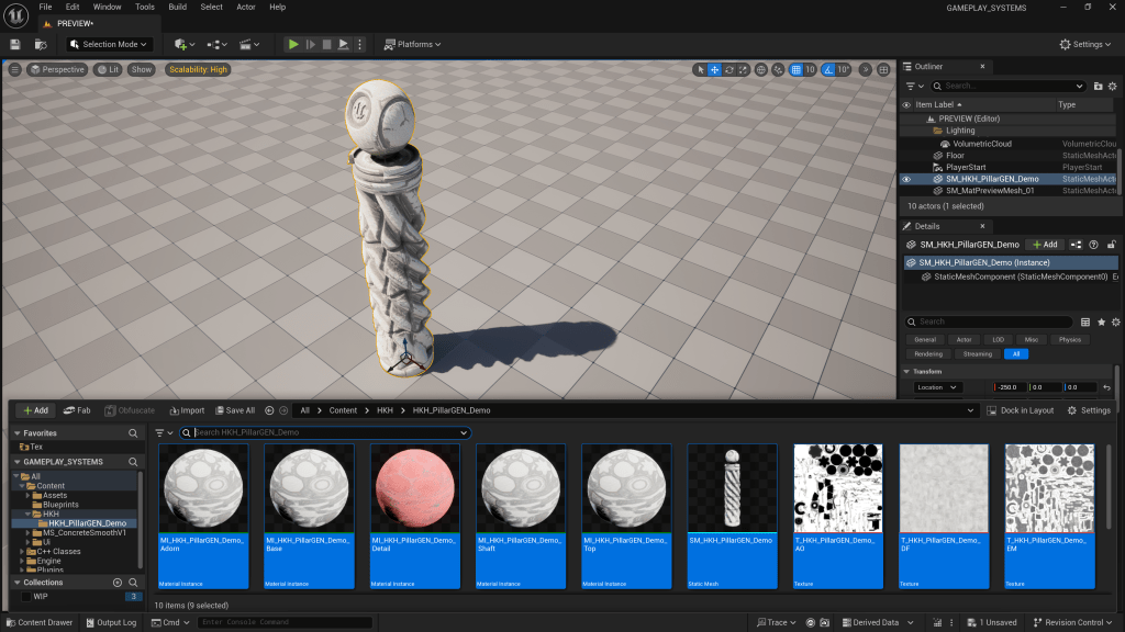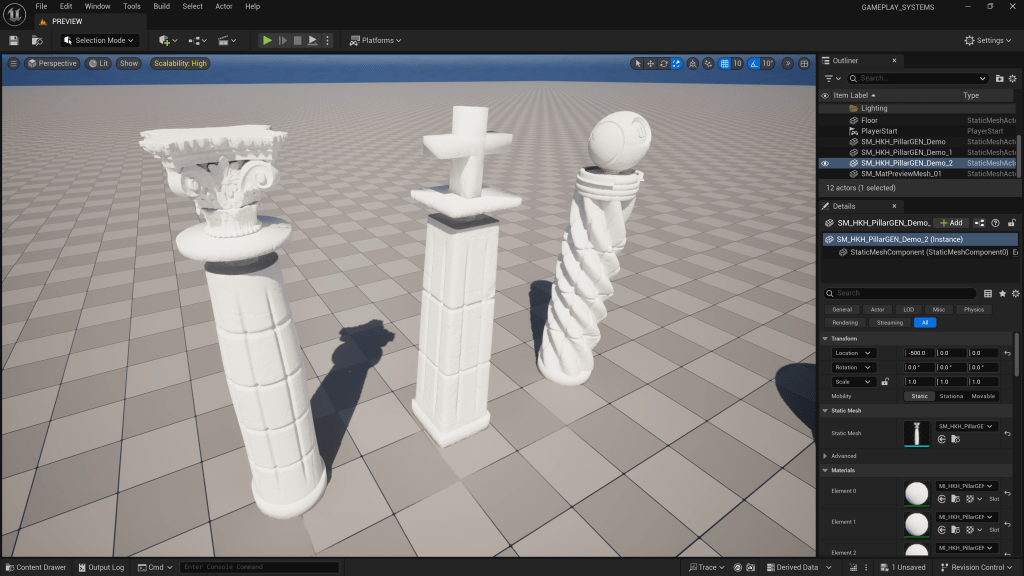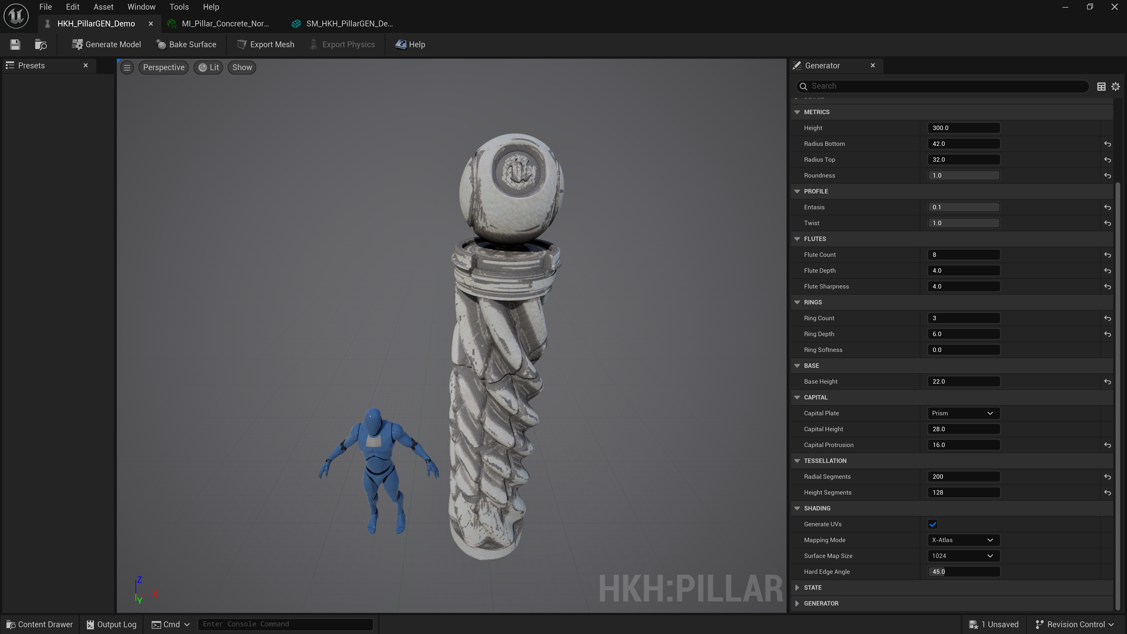 We implemented a dedicated SHKHPillarGenEditor toolkit, a custom Editor Mode with Slate widgets, parameter reflection, and viewport previews. Every tweak to height, radius, flute count, or twist dynamically rebuilds the mesh in memory through the UDynamicMesh API, streaming data directly to the viewport renderer.