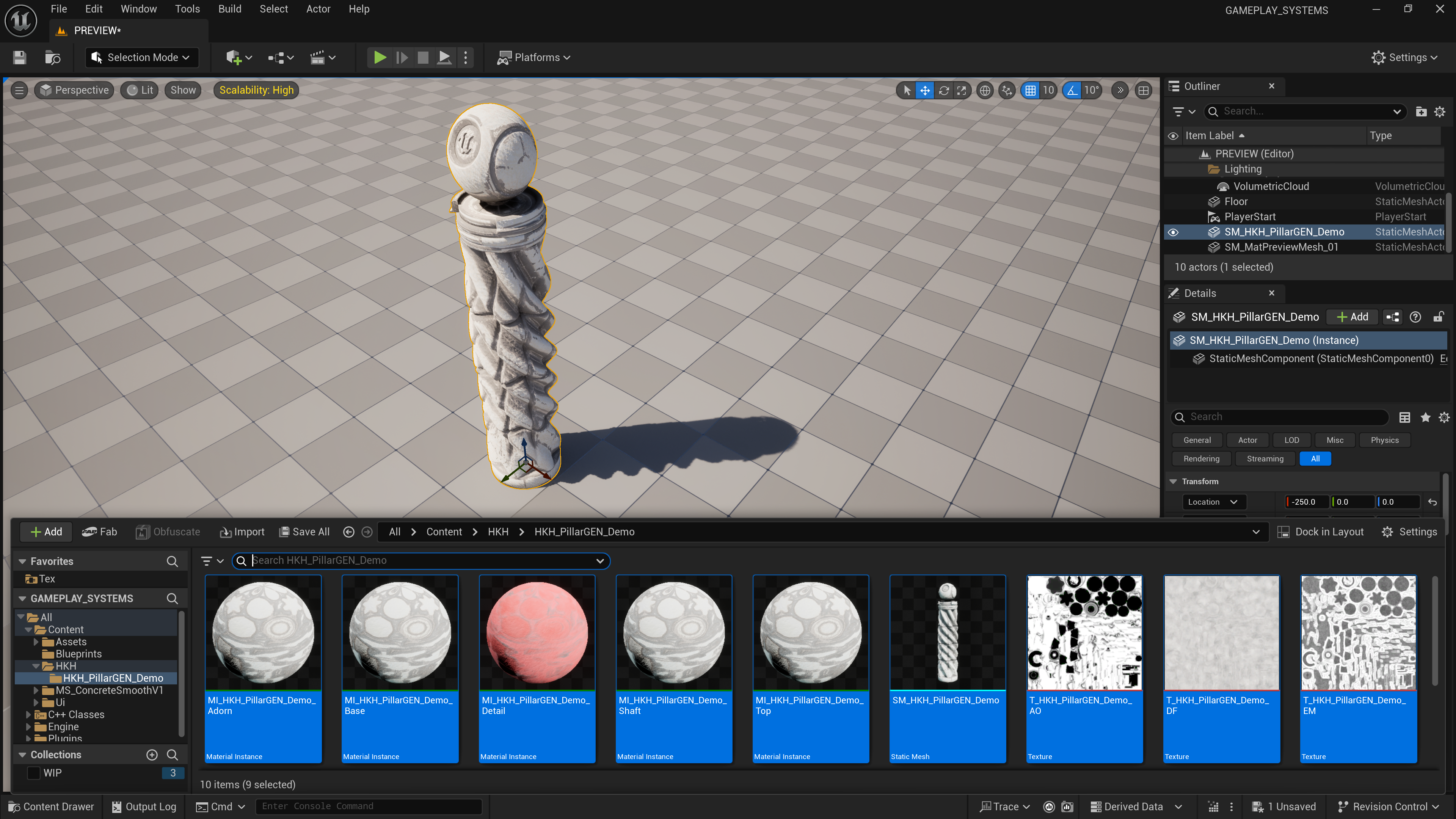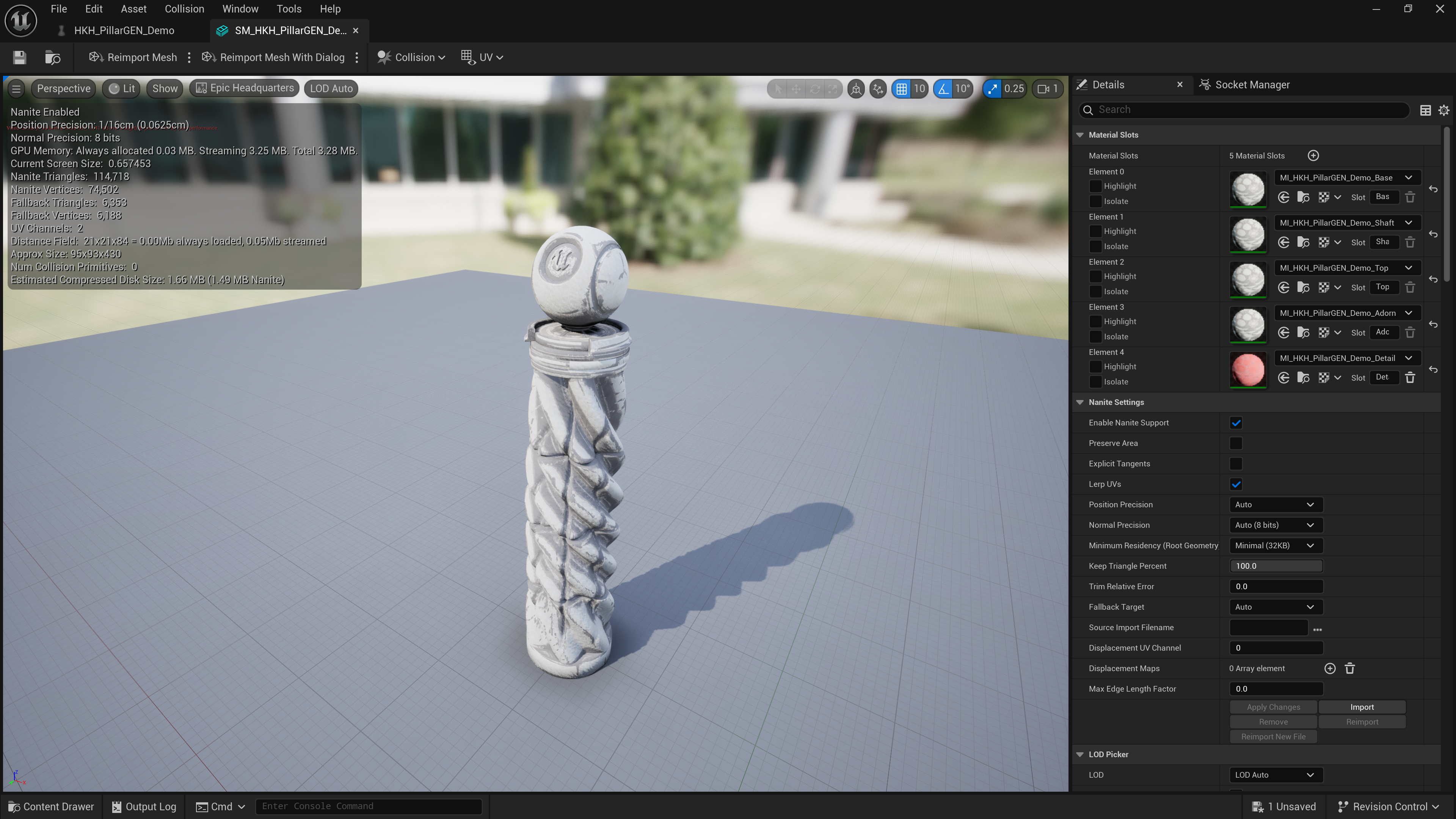 Every generated pillar can be baked directly into a StaticMesh asset, with collision, LODs, and UVs generated at build time.