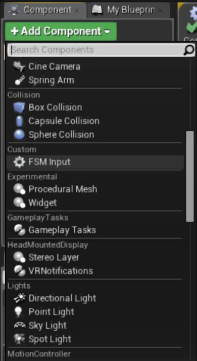 Now our FSM Component is marked active, let’s also open our Character Blueprint and add to it our newly created component, FSM_Input (under the ‘Custom’ section):