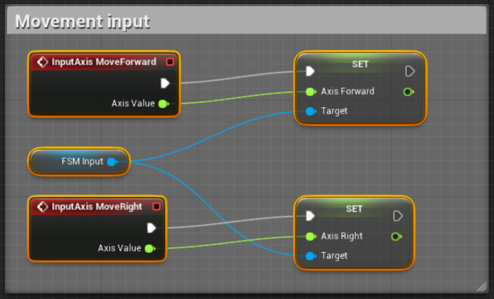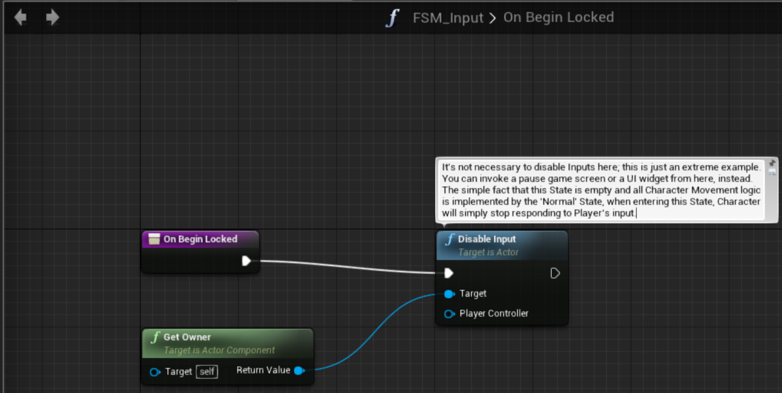 And later if we want to lock input for any reason, but still make Character receive input commands, will be as simple as setting FSM State to “Locked”.