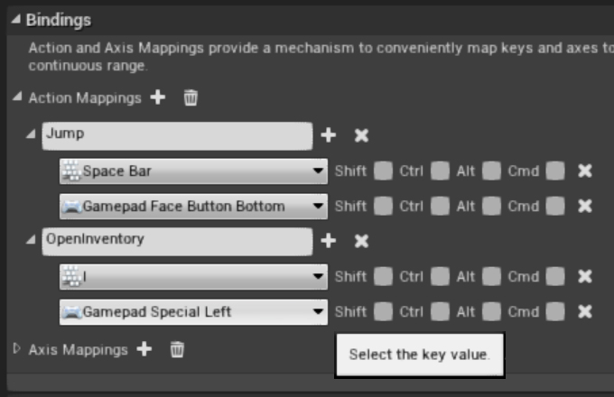 To test that, we quickly setup a new input command for the “i” key in project settings for bindings: