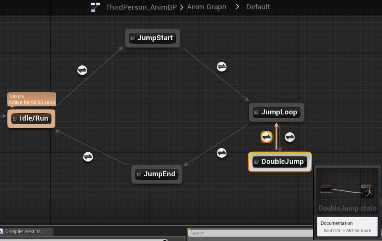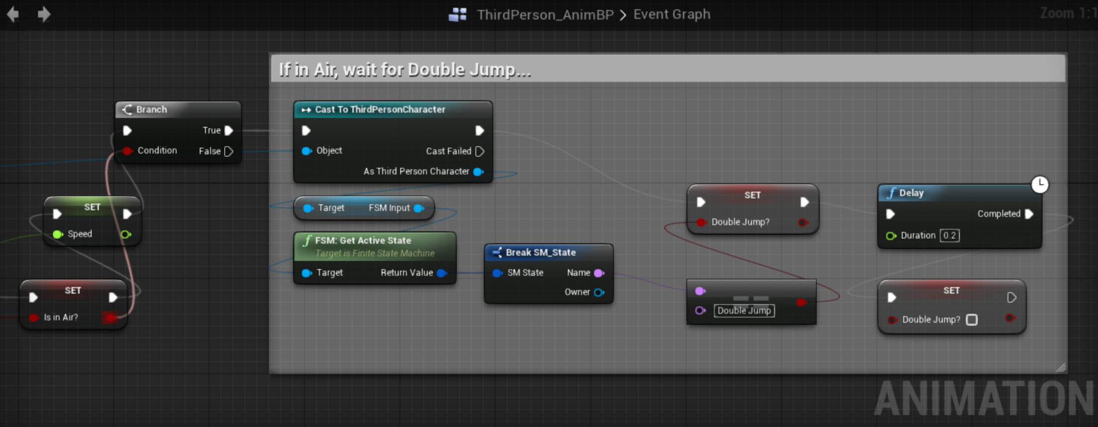 Implementing our ‘On Begin Jump’ State; this State will call the Character Blueprint’s Jump function and, if the character is already jumping, then it will prepare the necessary steps and allow character to perform a (bug free) double jump action: