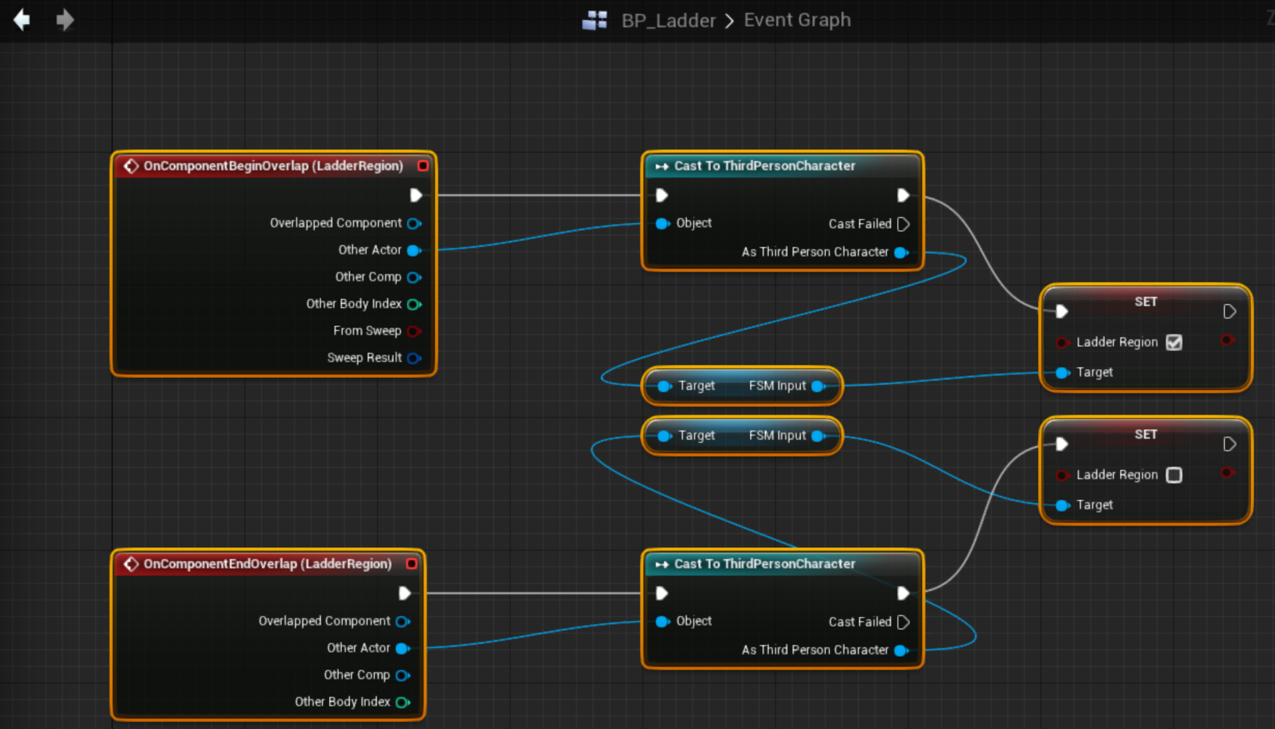 Inside the Ladder Blueprint, we setup it’s trigger to set the flag based on the fact that Character has entered or left the volume: